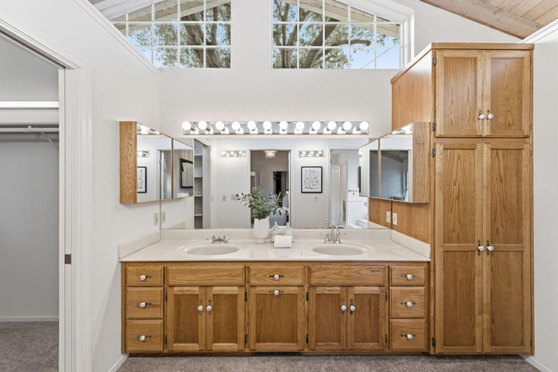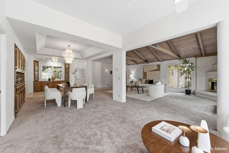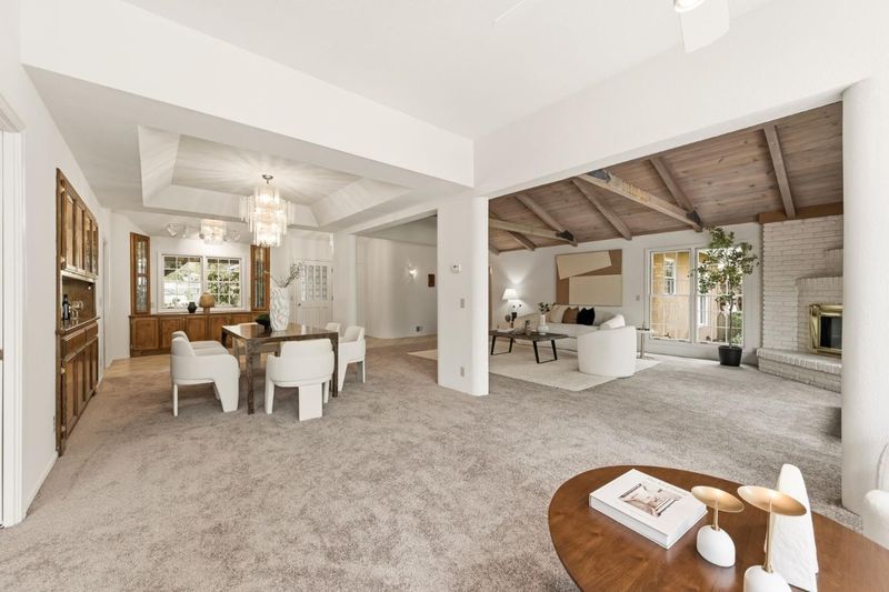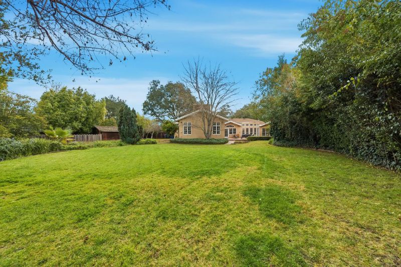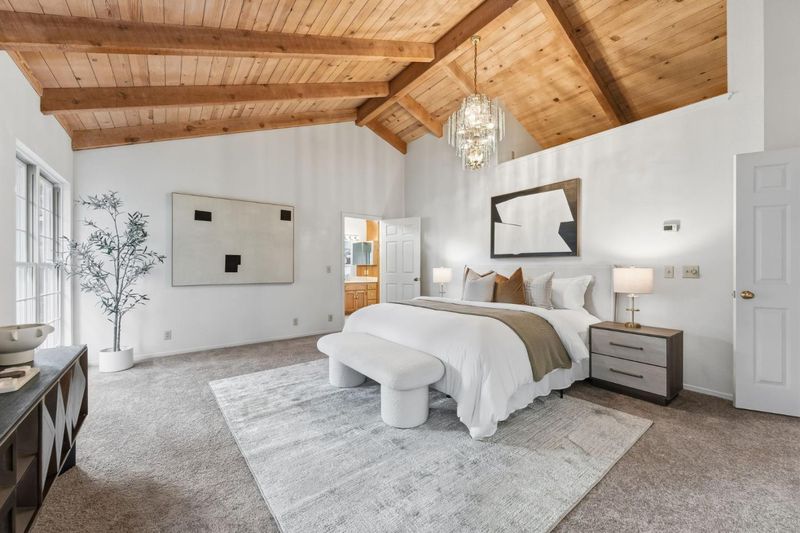Tucked away on a quiet cul-de-sac, this SE-facing property sits on nearly half an acre with a circular driveway beneath a magnificent Western Live Oak. Inside, the expansive formal living room with soaring cathedral ceilings and exposed natural-wood trusses creates an inviting space. Sunlight pours in through a rear wall of windows, connecting the home to the deck and lush backyard. The formal dining room showcases a grand chandelier, coved ceiling, and built-in china cabinet with a pass-through to the kitchen. The large kitchen echoes the home's architectural character with vaulted wood-trussed ceilings, a casual dining area, breakfast bar, generous storage, and walk-in pantry. The grand family room, centered around a stone fireplace, opens to the backyard through French doors. This wing also includes dual closets, a full bath, a loft area, and garage access, making it ideal for extended family living or an ADU. The private bedroom wing offers four bedrooms, two en-suite, including an oversized primary retreat with a light-filled bath, dual sinks, soaking tub, walk-in closets, and an outdoor feel. A connected sitting room provides a relaxing private oasis for unwinding. A three-car garage (parking for 5 cars), storage shed, and expansive lot provide exceptional privacy.
