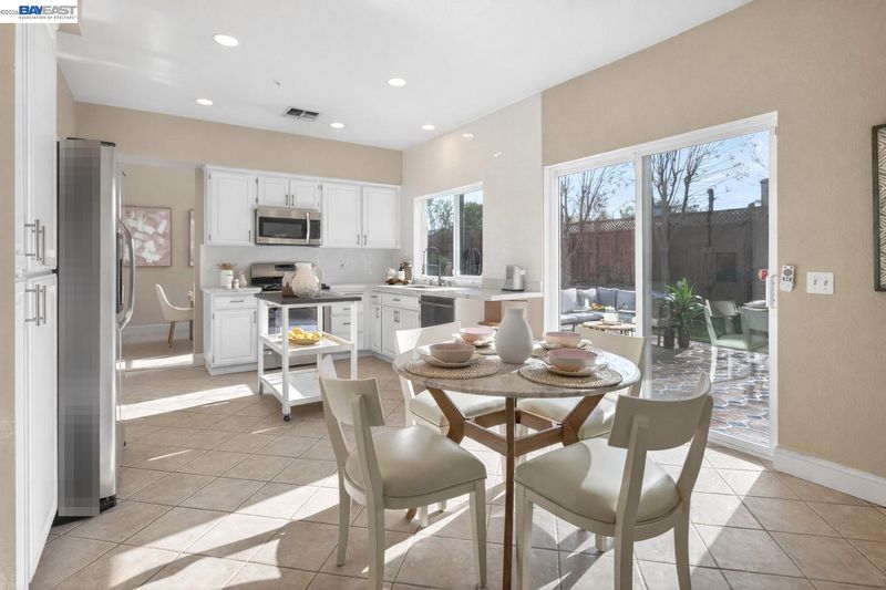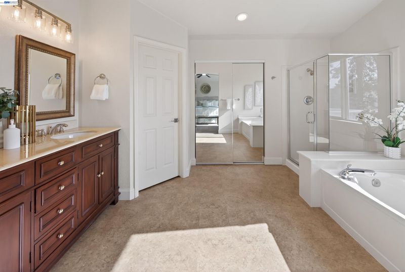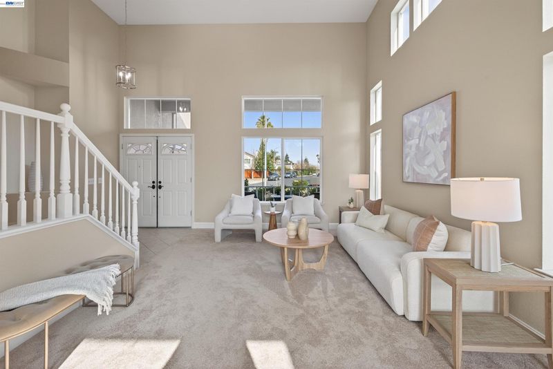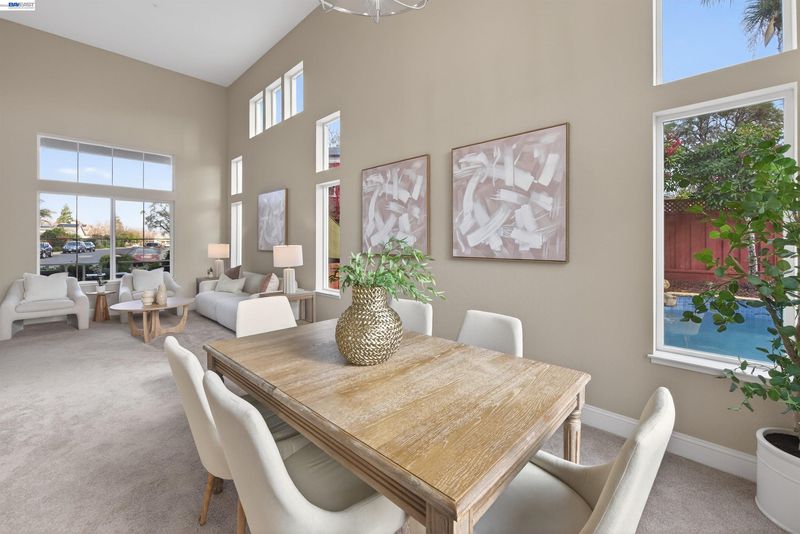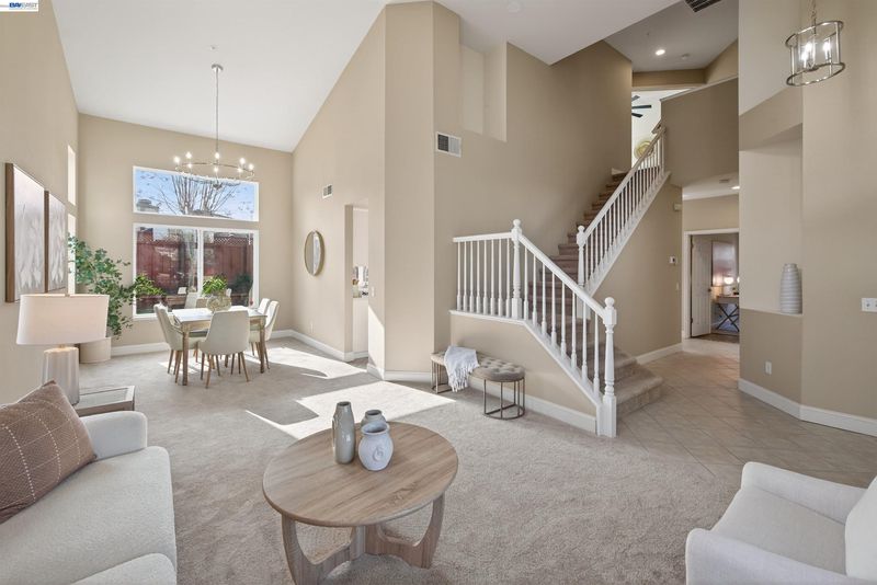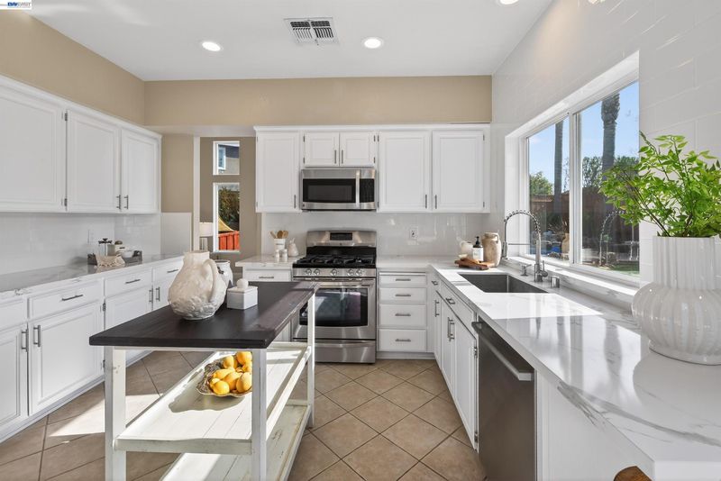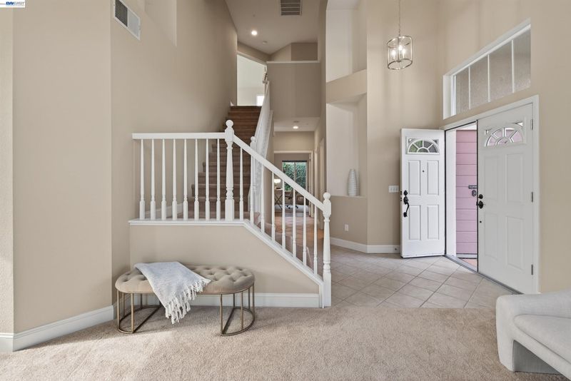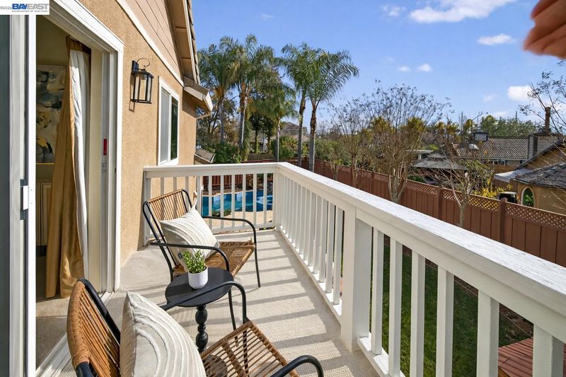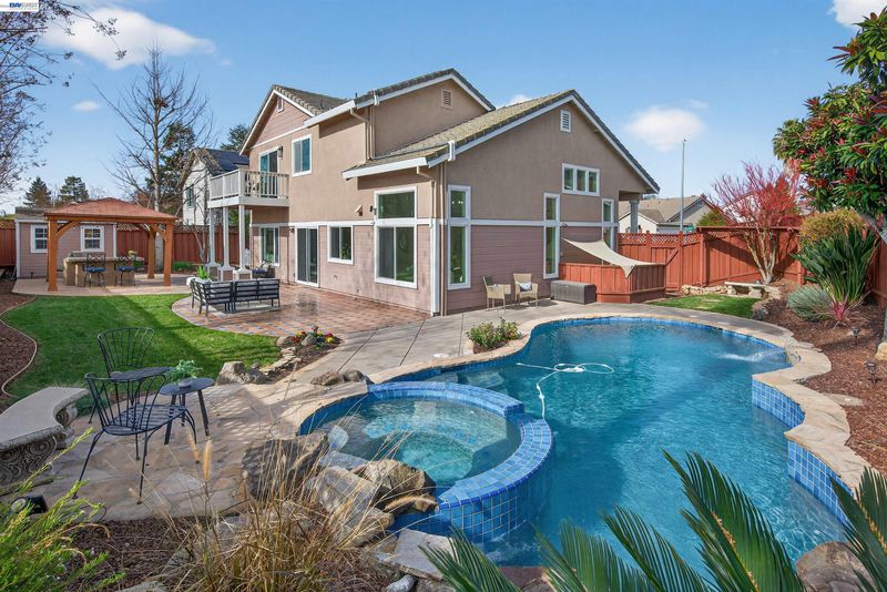 Welcome to this beautifully updated home featuring a highly desirable floor plan and a true backyard retreat! A NORTH FACING front door welcomes you into a light-filled interior with soaring two-story ceilings in the living and dining rooms, creating an airy and open atmosphere perfect for entertaining. The remodeled kitchen is a standout with QUARTZ COUNTERTOPS, gas range, subway tile backsplash, and a stylish accent wall, offering both modern design and everyday functionality. A FULL BEDROOM with walk-in closet AND BATH DOWNSTAIRS provide ideal flexibility for guests, multigenerational living, or a home office. Upstairs, retreat to the spacious primary suite complete with a private balcony, walk-in closet, and a spa-inspired bath featuring a walk-in shower, separate soaking tub, and a newer vanity with double sinks. Step outside to your backyard oasis showcasing a sparkling pool and spa with waterfalls, designed for year-round enjoyment. Entertain in style under the covered outdoor BBQ pavilion