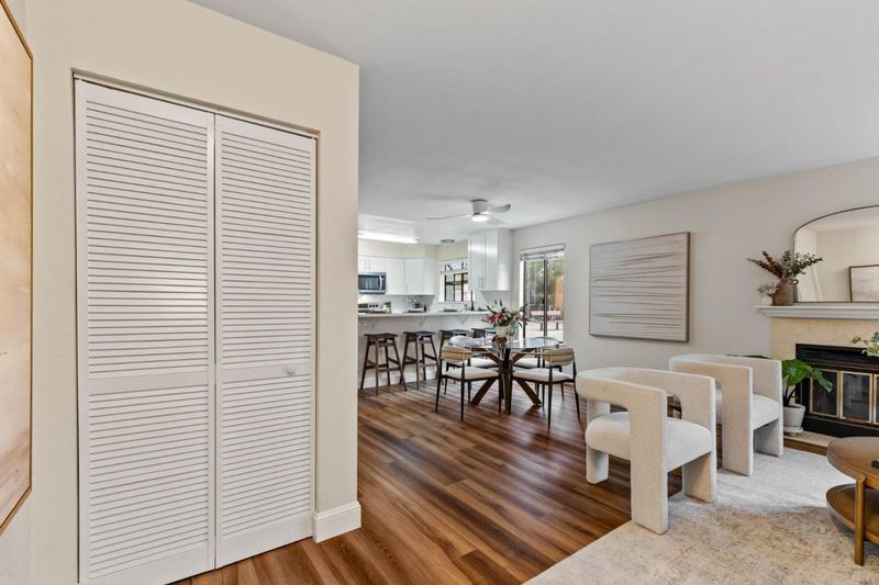 Discover elegance and comfort in this rare private end unit. This fully remodeled gem offers a sophisticated living experience. Sunlight dances through the spacious living areas, accentuating the open concept layout & main level bedroom. The kitchen boasts fresh white cabinetry with a chic stainless steel refrigerator, dishwasher, microwave, & a modern electric range. Quartz countertops & a convenient pantry cabinet complete this gourmet space. The luxury vinyl floors provide an elegant underfoot feel throughout, complemented by fresh paint. Upstairs, generously sized bedrooms feature custom organizers and access to two private balconies, perfect for relaxation. The large patio invites your green thumb forward, while the updated bathrooms and in-unit washer and dryer ensure convenience. Benefit from the security of two dedicated parking spaces in a gated underground area, enhanced by a Ring doorbell and floodlight camera. The community features a pool for leisurely afternoons & HOA dues covering water, garbage, & exterior maintenance. Positioned in a prime location, this home offers a serene escape amidst beautiful shade trees while being in one of Silicon Valley's most connected areas. An exquisite opportunity awaits you. Simply move in and start enjoying your new lifestyle