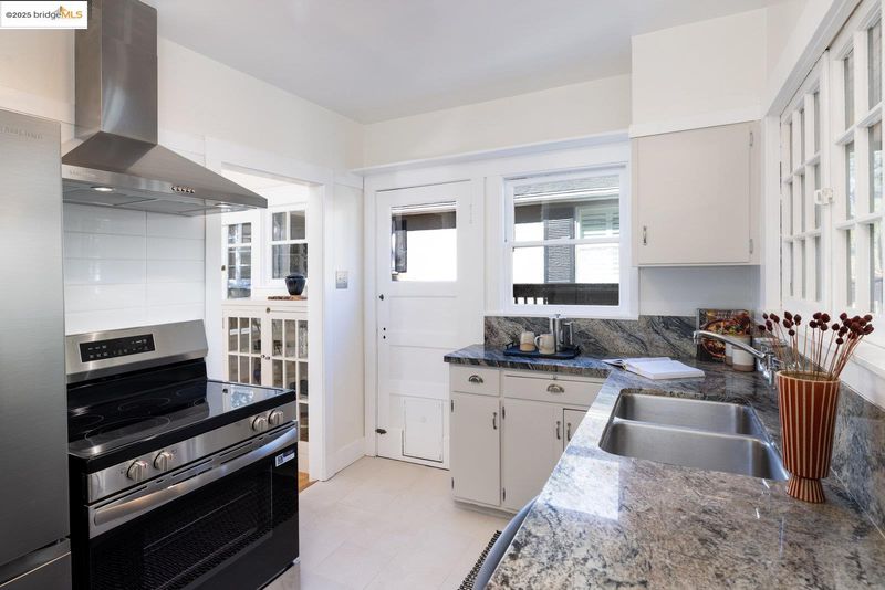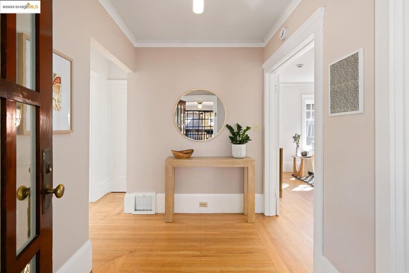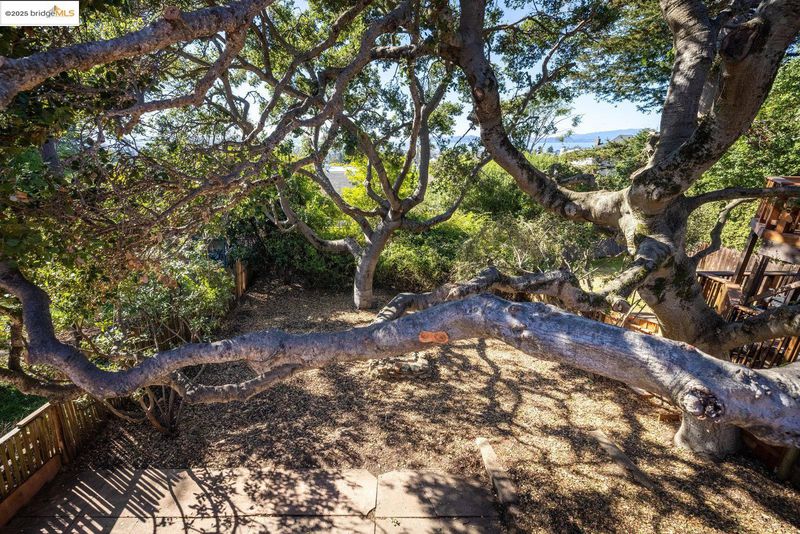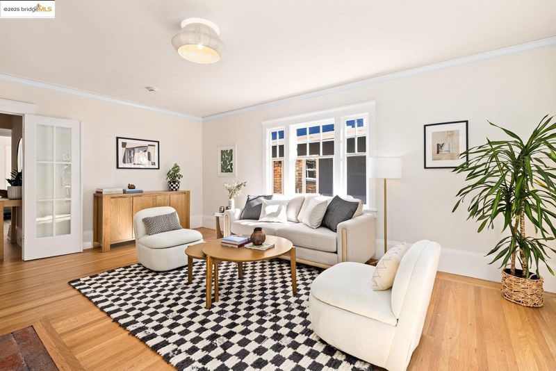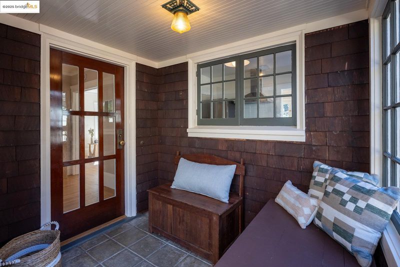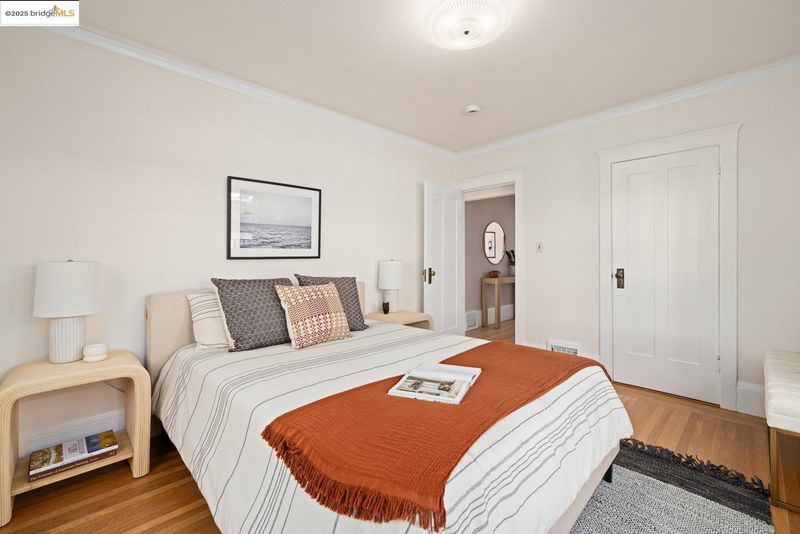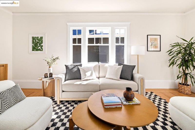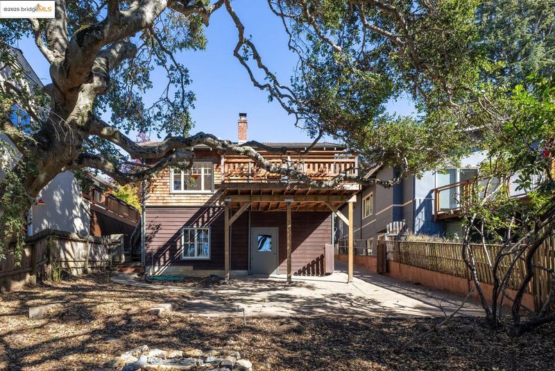 Nestled beneath a graceful canopy of heritage oaks, this classic North Berkeley bungalow captures the quiet beauty and craftsmanship of its era. Light filters through the trees and into every room, highlighting the home’s thoughtful proportions and timeless details. With approximately 1,034 square feet of living space*, the home offers a single-level floor plan with an accessible entry, two bedrooms, and one full bathroom. The sunny living room opens directly to a rear deck, perfect for morning coffee or an evening view of the Bay glimpsed through the branches. A covered front porch provides a welcoming transition from the front garden to the home, while an expansive rear yard invites outdoor living possibilities beneath the shelter of mature oaks. The home’s architectural character is expressed through wood shake siding, deep eaves with decorative knee braces, divided-light windows, oak floors, and built-in glass-front cabinetry that anchor the dining room with warmth and charm. Every detail reflects a balance of craftsmanship and simplicity, the essence of early Berkeley design. Located moments from North Shattuck favorites, including the Cheese Board, Chez Panisse, Live Oak Park, the Berkeley Rose Garden, and Codornices Park. Northbrae and Solano Avenue shops are all nearby.