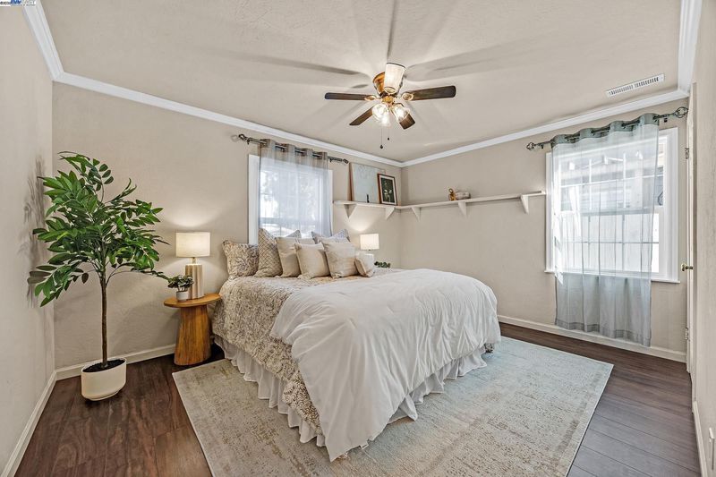 Welcome to this beautifully updated 3-bedroom, 2-bath residence that perfectly blends comfort, style, and functionality. Ideally located within walking distance to downtown and offering quick access to Hwy 580, this home provides easy living in the heart of the city. The open floor plan is filled with natural light, creating a warm and inviting atmosphere throughout. The kitchen showcases granite countertops, freshly painted cabinets, and a lovely bay window overlooking the yard. The adjoining living room features recessed lighting, ceiling speakers, a ceiling fan, and a wet bar—making it a great space for entertaining or relaxing at home.The primary suite offers a peaceful retreat with double sinks, granite counters, and a luxurious jetted Roman tub. Thoughtful upgrades include updated plumbing, new roof and gutters, modern light fixtures, durable flooring, and a fully permitted living area expansion. Step outside to a spacious covered patio ideal for gatherings, and enjoy the low-maintenance backyard .