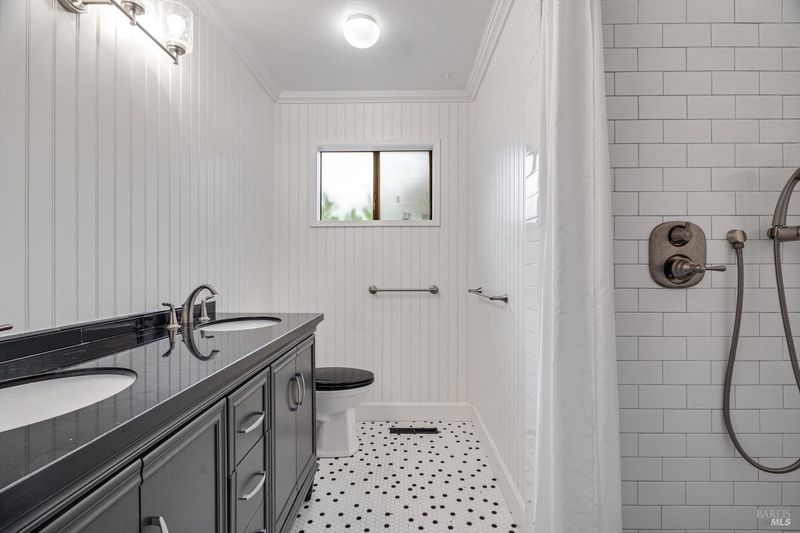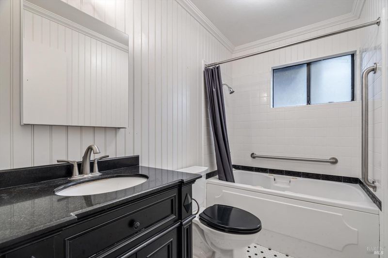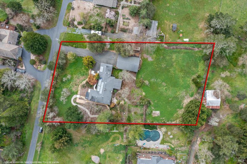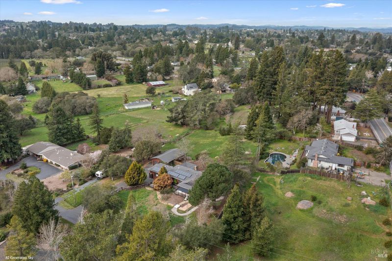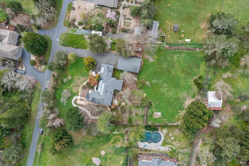 Predominantly single level home on a beautiful, usable, 1.25 acres in the Sebastopol countryside. A long wheelchair accessible ramp facilitates access to the front door from the driveway parking areas. The parcel itself is level to gently sloping with a small orchard in front, and a good sized, vehicle accessible pasture in back with fenced garden area and your own private redwood grove! Public records indicate 4 bedrooms, but only 3 are currently present. Significant past upgrades were made to the kitchen and both bathrooms. The kitchen has beautiful custom wood cabinetry, high quality windows, tile counter surfaces and floor, and a unique sculpted glass ceiling light fixture custom made for the prior owner. Custom wood trim and corbels highlight the dining room just off the kitchen. There are separate living and family rooms with wood flooring, including a pass thru bar from kitchen and 2 solar tubes in the family room. The apparent original garage has been converted; one can now enjoy a very large 2nd family room with multiple potential uses (has been used in the past as an Art Studio) featuring custom stained glass windows, open beam ceilings, a raised brick hearth with wood stove, mini split, and abundant storage. The Primary Suite features a shower over the large jetted tub, a walk-in closet with built-ins, and French patio doors to a completely screened-in, covered deck for year round outside enjoyment. I counted 19 solar panels on the roof (owned). The detached garage/shop building is approximately 26' x 40' (1,040 +/- sq. ft.!) which could comfortably accommodate 4+ cars PLUS shop space if the interior walls were reconfigured. The long driveway approach has room for an estimated 6-8 additional vehicles plus through access along the garage/shop to the rear portion of the property. Don't miss the small redwood grove at the top of property, a peaceful refuge and "cool spot" providing residents and visitors alike with a contemplative space and feeling of solitude right at home.