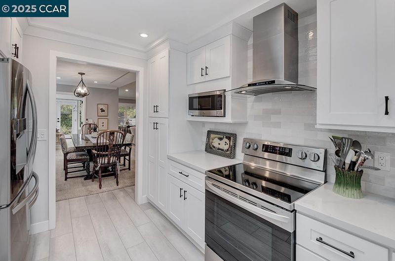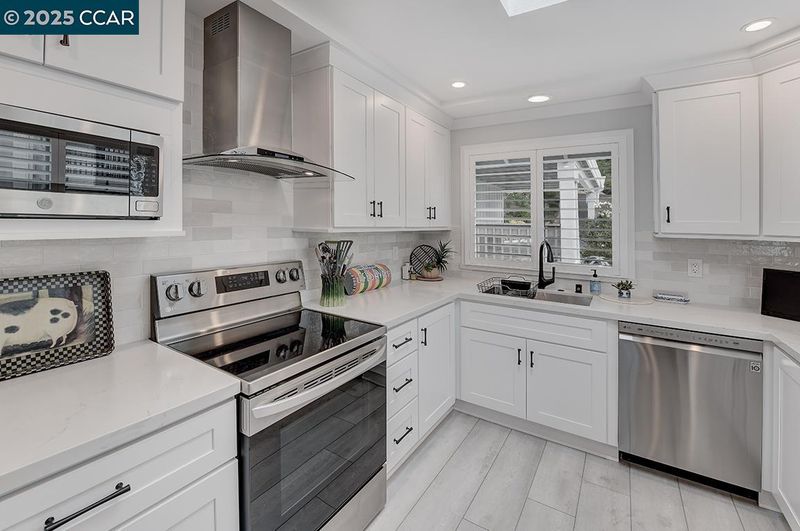 - Dishwasher, Electric Range, Microwave, Oven, Refrigerator, Self Cleaning Oven, 220 Volt Outlet, Counter - Solid Surface, Electric Range/Cooktop, Disposal, Oven Built-in, Self-Cleaning Oven, Updated Kitchen