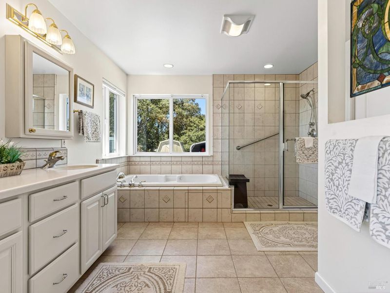 Double Sinks, Jetted Tub, Quartz, Shower Stall(s), Skylight/Solar Tube, Tile, Walk-In Closet, Window