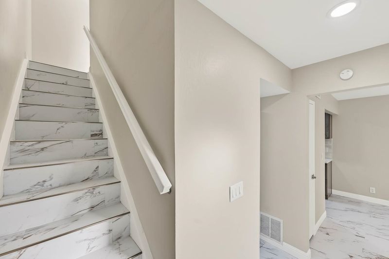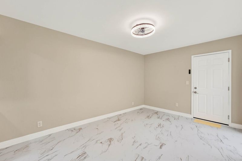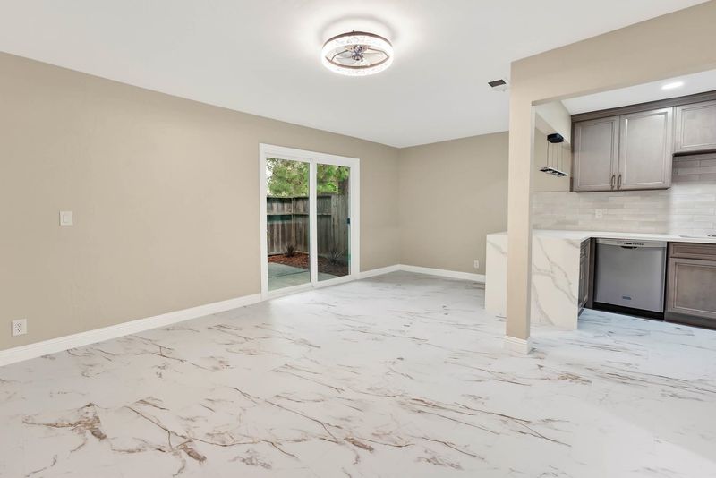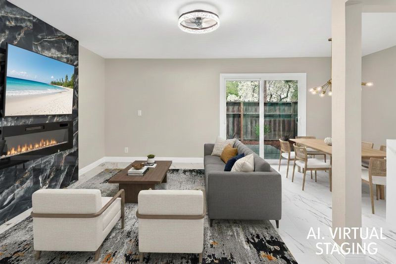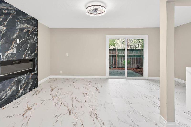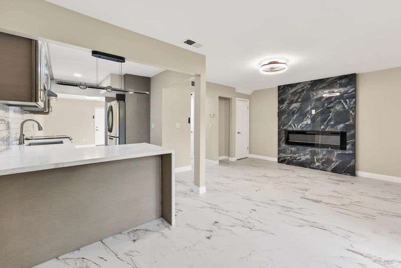 Experience the pinnacle of modern luxury in this fully transformed 1,263-square-foot townhome built in 1971. This 2-bedroom, 2-bathroom residence has been masterfully redesigned with a focus on high-end aesthetics, featuring expansive white marble-style flooring with dramatic gold veining that flows throughout the open floor plan. The designer kitchen is a showpiece of contemporary style, boasting quartz countertops with a waterfall edge, premium stainless steel appliances, and a textured subway tile backsplash. In the living area, a striking floor-to-ceiling black marble fireplace serves as a bold focal point. The primary suite offers a sophisticated retreat, complete with a trendy sliding barn door for the closet and a luxurious bathroom featuring an oversized walk-in shower with designer tile surrounds. Large sliding glass doors lead to a private, fenced rear patio, perfect for secluded outdoor relaxation. This home is further enhanced by a two-car garage and sits in a peaceful community characterized by mature pine trees and well-kept grounds. Every inch of this property has been reimagined to offer an upscale, turn-key lifestyle for the most discerning buyer.