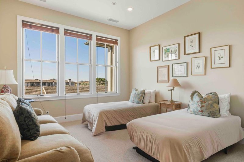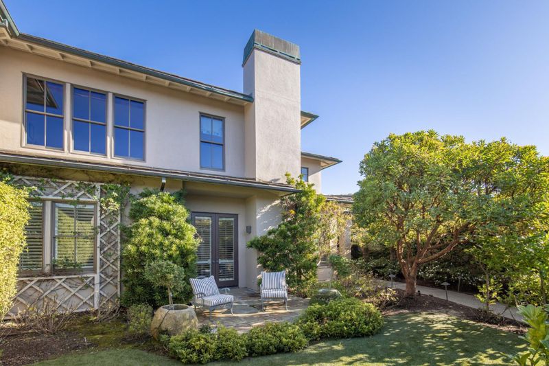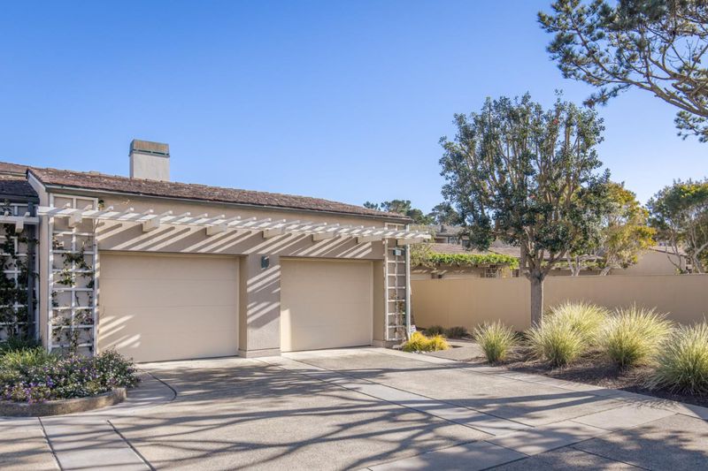 This Spanish Bay end unit, thoughtfully updated in 2019, is positioned just off the 12th tee of the Spanish Bay Links. Wide-plank hardwood floors, custom ironwork, and bespoke details create an elevated sense of character and quiet sophistication throughout. Southwest exposure, soaring ceilings, and expansive windows and doors on three sides flood the home with natural light from morning through evening. The kitchen features stainless steel countertops, top-of-the-line appliances, and a sun-filled eat-in area. The layout offers two primary suites, one on each level plus an additional en-suite bedroom and a dedicated office lined with bookshelves. Outdoor spaces include a beautifully landscaped, private front courtyard with lemon and avocado trees and the sound of the nearby waves, along with a rear patio suited for dining al fresco and easy entertaining, framed by established trees and newly landscaped grounds that provide a natural buffer from the tee.