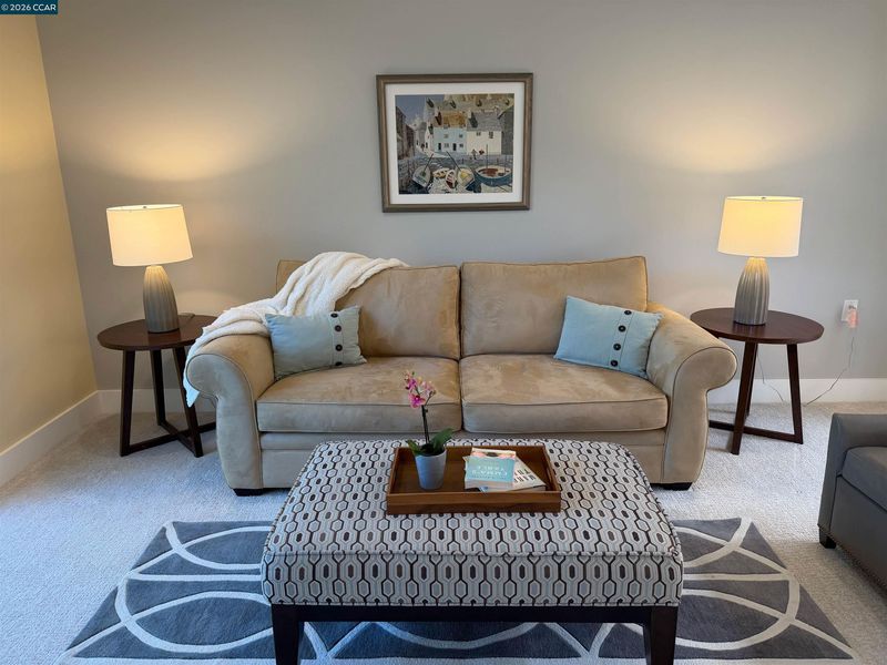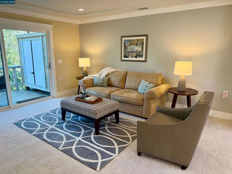 Beautifully reimagined Monterey model 2BR/2BA end unit filled with natural light and thoughtful upgrades throughout. Seamless reconfiguration enhances flow and functionality. Remodeled kitchen with custom cabinetry and stainless steel appliances. Updated bathrooms with modern finishes, including a bench in the primary shower. Crown molding and custom Smith & Noble window coverings throughout. Dining area features a modern coffered ceiling and custom cabinet wall with display lighting. Primary suite offers a tray ceiling and walk-in closet. Wired for surround sound with built-in speakers. Enjoy a peaceful, tree-surrounded back deck. A must-see home.