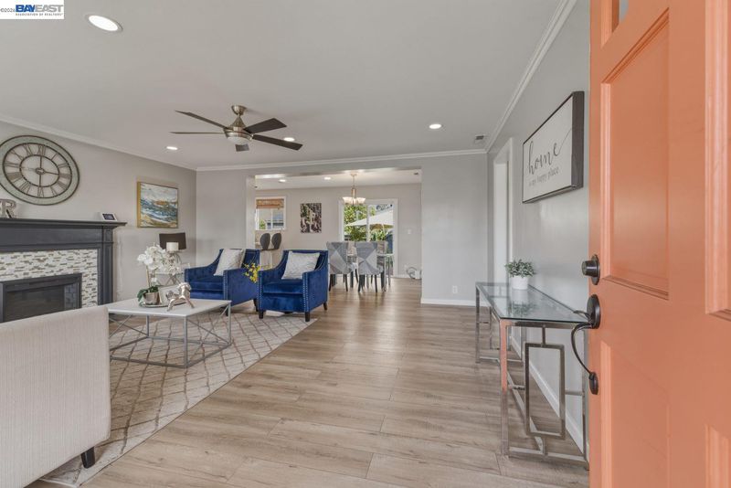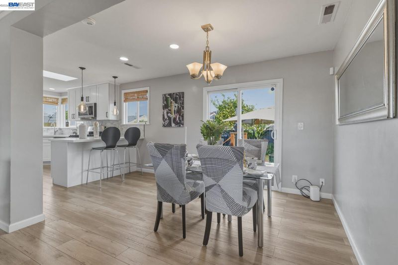 Absolutely stunning, fully upgraded home featuring a permitted expansion to 3 bedrooms and 2 bathrooms with approximately 1,554 sq ft of living space. This light-filled home offers an open and functional layout with luxury laminate flooring, fresh interior and exterior paint, crown molding, and recessed lighting throughout. The modern kitchen is designed for both style and functionality, featuring quartz countertops, shaker cabinetry, a peninsula breakfast bar, and new stainless steel appliances. Dual pane windows provide energy efficiency and a quiet interior environment. Both bathrooms have been tastefully remodeled, and the home is equipped with central heating and air conditioning along with a smart thermostat for year-round comfort. Owned solar adds long-term energy savings. Step outside to an expansive, low-maintenance backyard ideal for entertaining, gardening, or relaxing, complete with mature fruit trees. Conveniently located near downtown San Leandro, BART, Costco, and major freeways (580/880), offering easy access to shopping, dining, and commuting.