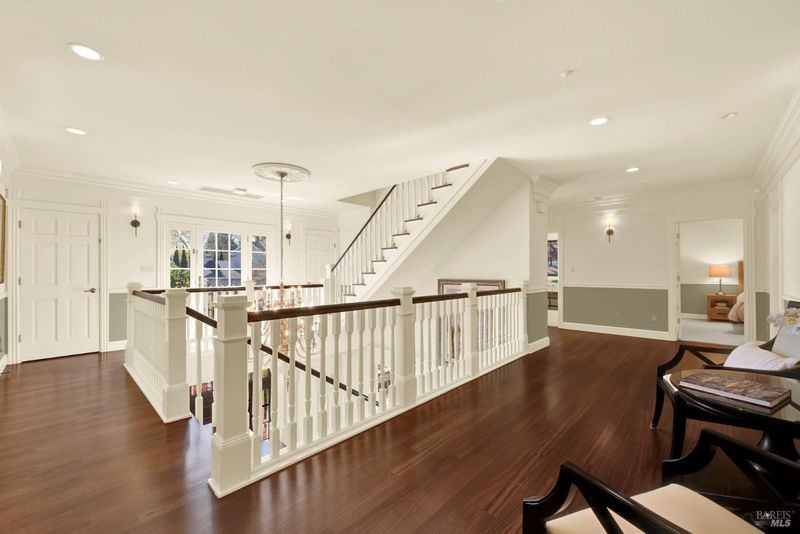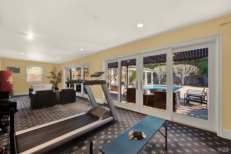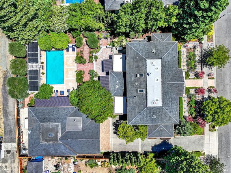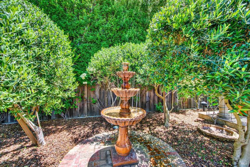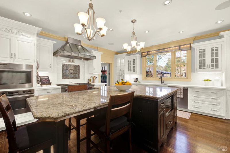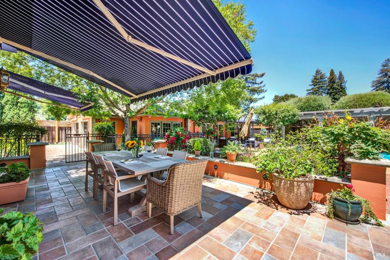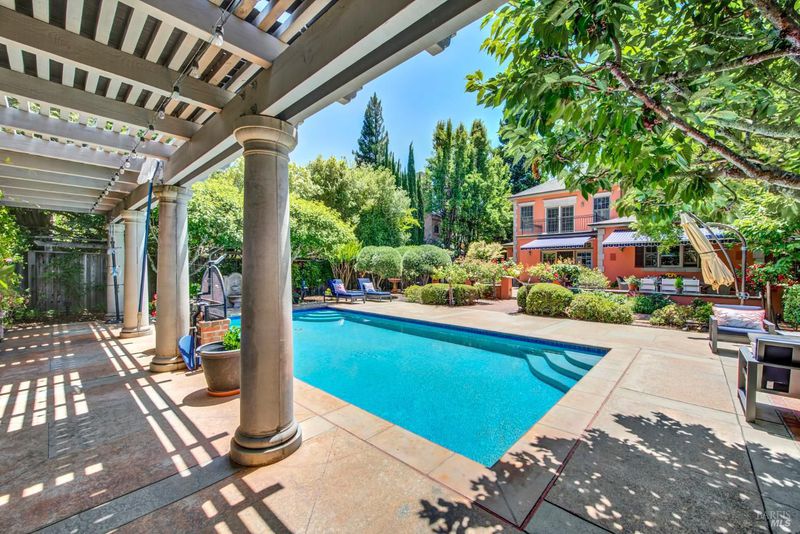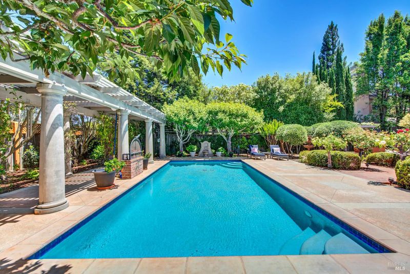 Located on a quiet court in one of Napa's most desirable neighborhoods, this beautifully designed residence offers timeless architecture, thoughtful updates, and exceptional indoor-outdoor living. Gracious formal spaces include an elegant living room and dining room, each with gas fireplaces and refined detailing, along with a library, alcove, and a spacious family room featuring new carpet and a whole-house audio/visual system. The heart of the home is the newly updated kitchen (2025), appointed with a Wolf range (2025), Sub-Zero, Miele, and Bosch appliances, quartz countertops, a generous center island with filtered-water sink, extensive custom cabinetry, and an adjacent expansive dining area. A walk-in pantry provides abundant storage. The near-by dedicated wine closet accommodates approximately 200 bottles. A light-filled sun room with custom cabinetry, beverage refrigerator, dry bar, skylight, and built-in bench seating (with custom pad and pillows) opens seamlessly to the backyard. Upstairs, the primary suite offers a private retreat with French doors to a balcony overlooking the resort like backyard The beautifully remodeled bath features dual vanities, soaking tub, marble stall shower, and custom finishes. Of the three additional bedrooms, one includes a private en-suite. The stunning remodeled hall bath boasts it's own private balcony access. A well-appointed second-level laundry room and a flexible third-level space ideal for an office, studio, fitness, or storage complete the interior. The professionally landscaped grounds are designed for relaxed Napa Valley living, featuring a solar-heated pool, gas fire pit, decorative fountains, multiple patios, and motorized retractable awnings. The private cabana enhances the outdoor experience with HVAC, full bathroom, outdoor half bath, exterior shower, and flexible lounge or fitness space. The oversized garage, (parking for five cars) features an integrated garden shop with counter, cabinets and sink. In addition the garage has an interior workshop with counter, cabinets and sink, a ceiling mounted air pump and attic storage round out the expansive garage space. The long private driveway is set back from the road, providing ample parking and privacy. Located in the sought after Browns Valley elementary school district (Buyer to verify eligibility and availability) Near parks and Westwood Hills hiking trails, this exceptional home offers sophistication, privacy, and resort-style amenities