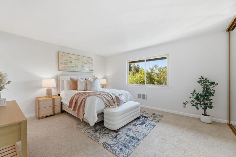 Step inside to discover a bright and open living space filled with natural light from large windows and sliding glass doors that open to a spacious private deck perfect for relaxing or entertaining while enjoying views of the pool and gardens. The freshly painted interior and new carpet create a crisp, move-in-ready feel. The kitchen offers generous cabinetry and counter space, blending functionality with charm. This beautifully maintained 2-bedroom, 2-bath end-unit condo enjoys a prime interior location within the community, overlooking the soothing fountains and lush greenery that make this complex such a special place to call home. The primary suite features an en-suite bath and ample closet space, while the second bedroom is ideal for guests or a home office. Additional conveniences include in-unit laundry, assigned parking, and easy access to community amenities like the sparkling pool, spa, and beautifully maintained walkways. Located close to downtown Mountain View, Caltrain, major tech campuses, and top-rated schools, this serene condo combines comfort, style, and an unbeatable location the perfect blend of tranquility and convenience.