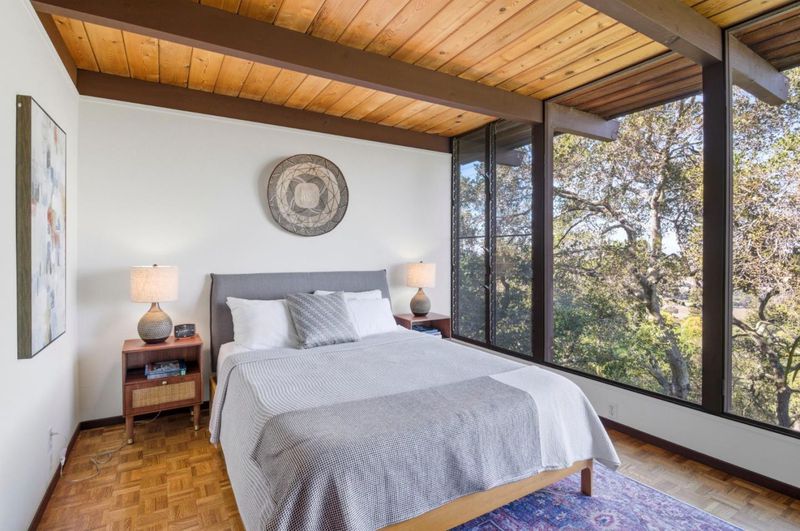 Mid-Century Modern enthusiasts will delight in this one of a kind architectural gem. Designed by architect Alan Blair, this home boasts blissful views reaching from San Francisco to Santa Clara. An entertainers dream! Tucked away from the flats, this stunning retreat is quiet and private. The home boasts three large decks, a hot tub, two gas fireplaces, an expansive remodeled lower level and two Tesla chargers in the garage, five bedrooms and three and a half bathrooms, an office upstairs and two living areas. The dining room contains Herman Miller light fixtures and high ceilings meet walls of expansive glass to thrill and entertain guests. Come claim this magical home that some have said has the best views in the Silicon Valley.