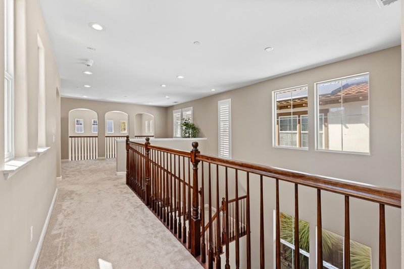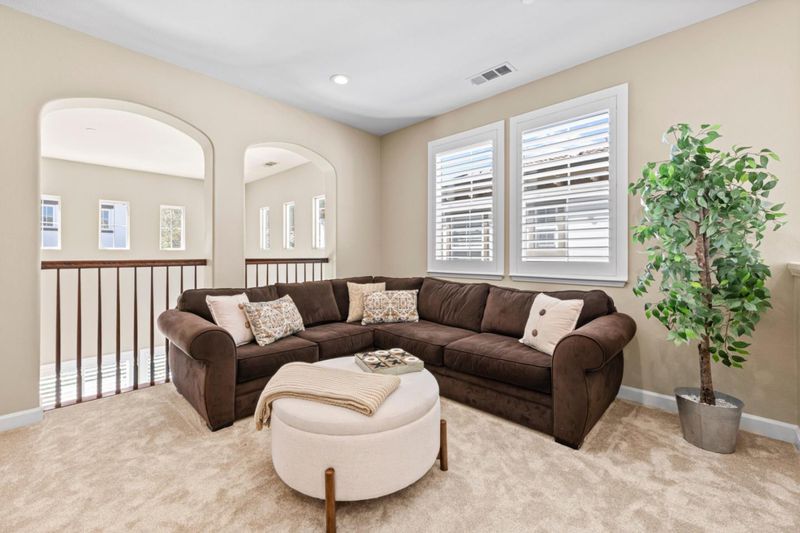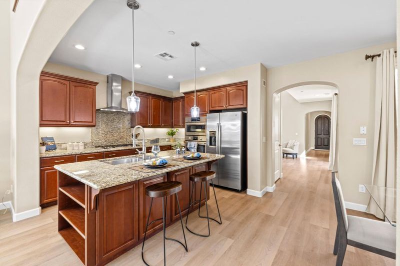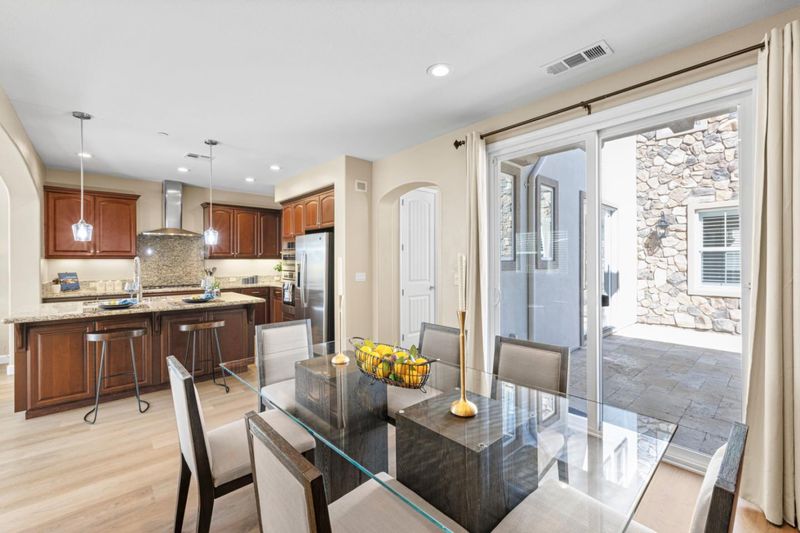 Discover the charm of this Creekside home in the golf course community of Eagle Ridge! Showcasing a striking Mediterranean-inspired exterior with a distinctive rock facade, this home is ideally located just steps from the community park and pool--perfect for family fun and proximity to many of the Eagle Ridge activities! This inviting home features rich LVP flooring on the 1st floor, Andersen French doors and plantation shutters throughout. A versatile front living room with French doors can serve as a home office or guest bedroom. The formal dining room with soaring ceilings opens to a spacious side courtyard, creating an ideal entertaining space. The gourmet kitchen offers granite slab countertops, Bosch stainless steel appliances, and a cozy breakfast nook with built-in hutch, all flowing into the family room with fireplace and entertainment niche. The well-designed floor plan includes 4 bedrooms and 3 full baths, with a convenient downstairs guest room and bath. Upstairs, a large loft with built-in entertainment center and bookcases provides flexible living space. The primary suite features a private French balcony and spa-like bath. Additional highlights include a stylish porte-cochère, leased solar, 3-car garage, and travertine hardscape, completing this pristine home.