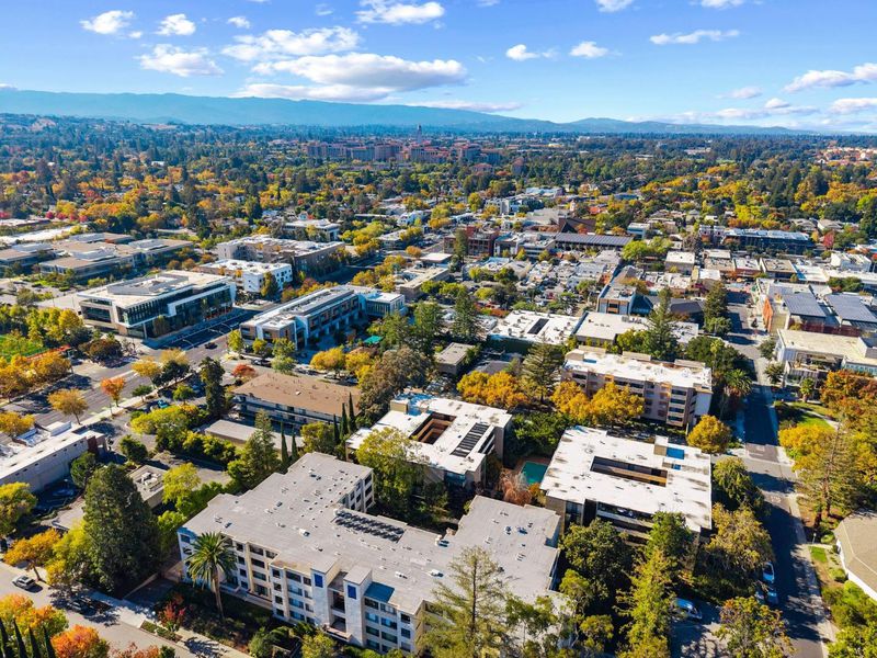 Blocks away from California Ave, minutes from Stanford, this updated end-unit is open & bright and is one of very few units in the complex with A/C system. New mini-split units have been installed in each room with HOA approval and city permits providing both heating & cooling in addition to the radiant heating system. Abundance of natural lights flow throughout every corner with floor-to-ceiling glass. Spacious living room features recessed lights and sliding doors to a spacious balcony overlooking the interior of the community. Dining area, open to kitchen has entire wall of sliding glass doors to a balconette with gorgeous tree view and complete privacy. Updated kitchen features white cabinetry topped in granite slab and stainless steel appliances. Bedrooms are located in a separate wing, highlighted by a primary bedroom suite with walk-in closet, updated en-suite bath and baclonette with tree views and complete privacy. Inside laundry (plus HOA has additional laundry facility). HOA amenities include pool, BBQ area, elevators, bike storage room. HOA covers water, garbage and radiant heating. Designated garage parking plus additional parking space available to rent from HOA plus street parking permit available through the city. Excellent Palo Alto schools.