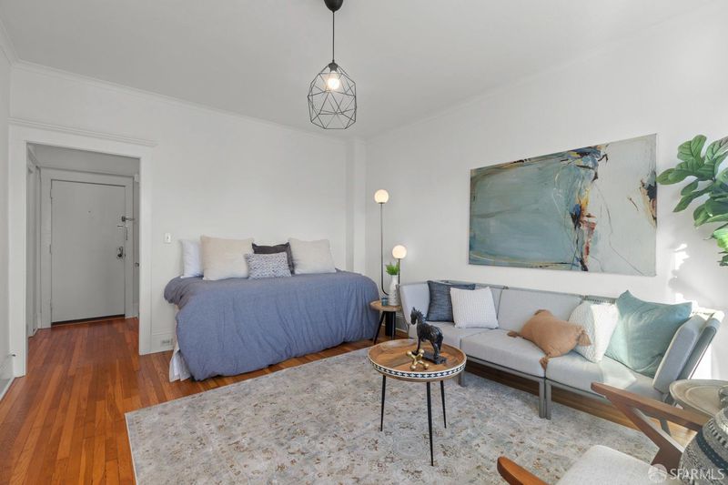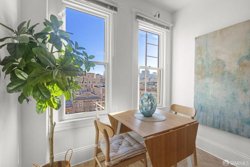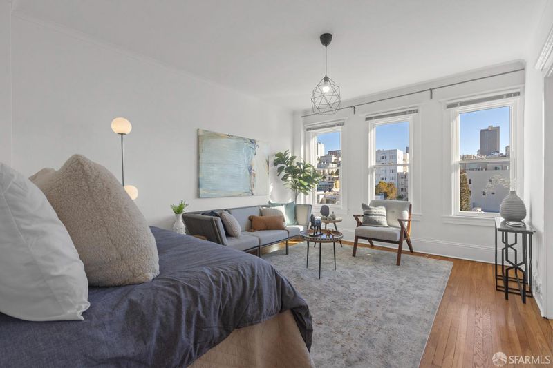 Wake up to soft morning light and iconic San Francisco outlooks in this generous top floor, east facing studio in the heart of the City in Cow Hollow. Enjoy a picturesque breakfast looking out toward the Transamerica Pyramid, Salesforce Tower, the green slopes of Russian Hill and lots of open sky. The well designed layout offers a spacious living area with hardwood floors, a separate eat in kitchen accented by bold cabinetry and sleek quartz countertops, and standout storage, including a large walk-in closet that can double as an office nook. The building has seen extensive upgrades in recent years, including double paned windows, exterior waterproofing, a new elevator, refreshed common area carpet and paint, and a gated entry with a modern intercom system. Shared amenities include a welcoming back patio with lounge seating, a fire pit, and outdoor dining, along with shared laundry and zero step entry at the lower level. A deep, private storage closet is included with the unit. The location offers the ideal first city home, pied-a-terre living, or investment option with easy access to the vibrant amenities of Polk, Union, Chestnut and Fillmore Streets, and Fisherman's Wharf. Enjoy jogging or cycling along the Bay trails, Sunday farmers markets at Fort Mason, and green spaces of Moscone Park, Aquatic Park, and Marina Green. Nearby transit options and tech shuttle stops make car-free living a breeze.