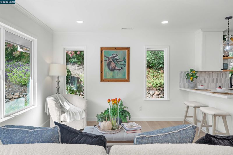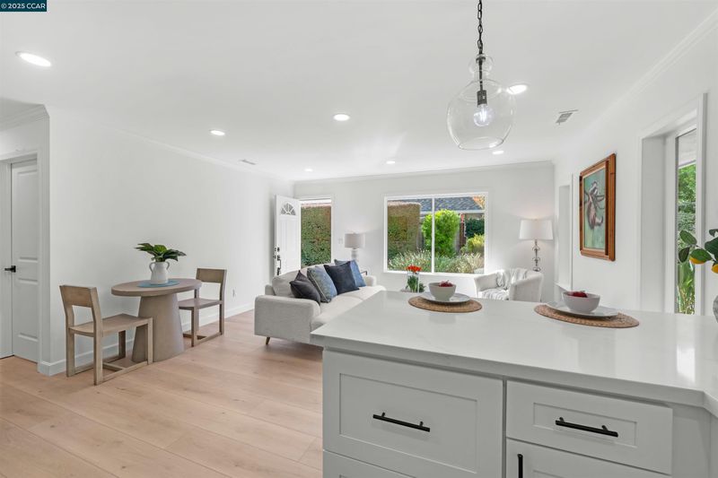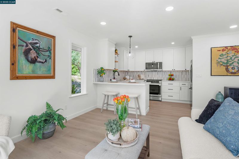 Whimsy — a uniquely remodeled Mendocino condo with 2 bedrooms, 2 full bathrooms, and a modern, contemporary design. Traditional Mendocinos have just one bedroom and bath, but this one-of-a-kind layout offers added flexibility and comfort—all on one level with no stairs and no one above or below. The bright, open living area features wide-plank vinyl flooring, recessed lighting, and extra windows, including one over the kitchen sink for abundant natural light. The kitchen showcases white cabinetry, quartz counters, a tile backsplash, open shelving, wine rack, and all-new stainless steel appliances. The primary suite includes a walk-in closet and a luxurious bath with double sinks, quartz counters, black fixtures, and a tiled shower. The guest bedroom and second full bath echo the same crisp, modern style. Both bedrooms open to a large patio. Additional highlights include skylights, a laundry/utility room with stacked washer and dryer, and nearby parking with extra storage. Petite, charming, and wonderfully livable, Whimsy is set in a sunny, walkable neighborhood within Rossmoor’s 55+ active-adult community, offering resort-style amenities including golf, pickleball, swimming, fitness, and clubs.