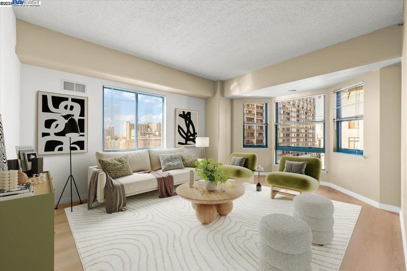 Great opportunity for a one level, two-bedroom, 2 bath corner unit in Pacific Renaissance Plaza, in the heart of Oakland’s vibrant Chinatown. Facing north and west with views of downtown and San Francisco Bay, this unit features a fully equipped kitchen including refrigerator with city view, spacious living room with bay windows and city and Bay views, large primary bedroom with en-suite bathroom and second bedroom, both with city views, and newer plank flooring throughout. HOA amenities include elevators, community laundry, garden terrace on 3rd floor, trash chutes on each floor, water and hot water. Pacific Renaissance Plaza features professional on-site management, a secure lobby with controlled access, assigned underground parking for residents and convenient public parking for visitors, 24-hour security, shops, bank and Asian branch library. Ideal location close to Oakland's Financial District, Jack London Square, 12th Street BART station and Old Oakland Farmers' Market on Fridays, plus easy access to 880 and 580. Property is virtually staged. Open House 11/8 & 11/9, 1:00 - 4:00 PM.