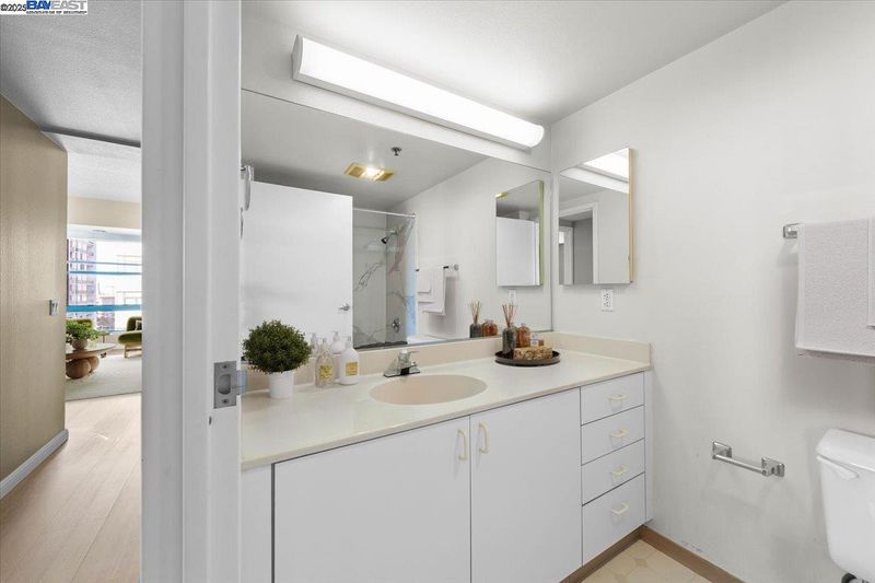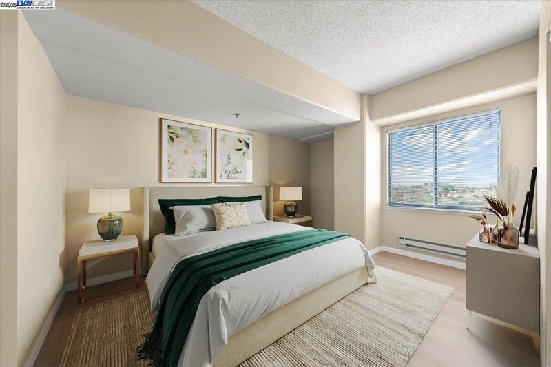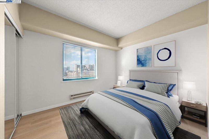 Great opportunity for a one level, two-bedroom, 2 bath corner unit in Pacific Renaissance Plaza, in the heart of Oakland’s vibrant Chinatown. Facing north and west with views of downtown and San Francisco Bay, this unit features a fully equipped kitchen including refrigerator with city view, spacious living room with bay windows and Bay views, large primary bedroom with en-suite bathroom and second bedroom, both with city views, newer paint and newer plank flooring throughout. HOA amenities include elevators, community laundry, garden terrace on 3rd floor, trash chutes on each floor, water and hot water. Pacific Renaissance Plaza features professional on-site management, a secure lobby with controlled access, assigned underground parking for residents and convenient public parking for visitors, 24-hour security, shops, bank and Asian branch library. Ideal location close to Oakland's Financial District, Jack London Square, 12th Street BART station, Old Oakland Farmers' Market, easy access to 880/580