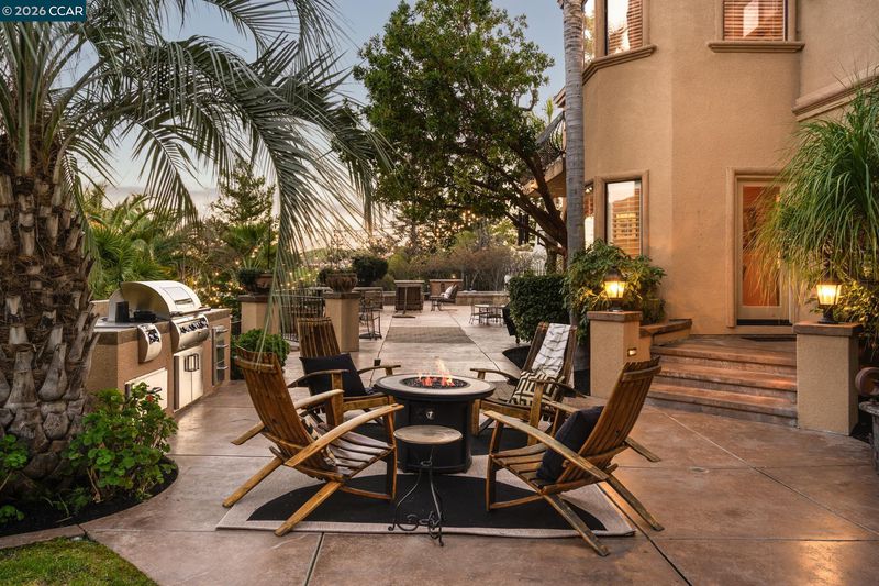Tucked behind the gates of Blackhawk Country Club on a private 1.87-acre lot, this distinctive estate offers a sophisticated resort-style lifestyle. Designed for seamless indoor-outdoor living & expansive entertaining, the property features a destination backyard backing to open space with east-facing views of the Tassajara Valley. 4,919sqft with 4 beds & 3.5 baths, including a bonus room (potential bedroom) & executive office. The chef’s kitchen features new Viking, Bosch & KitchenAid appliances, granite countertops, custom cabinetry, a large center island, walk-in pantry, & dining nook. Outdoor living includes multiple patios on two levels, a solar-heated pool & spa, sports court, built-in grill, manicured lawns, & mature palms. A standout approx 300sqft cabana offers a wood-burning fireplace & 4 sets of fold-away French doors opening to the gardens & views, ideal for gatherings day or night. The primary suite includes a private balcony overlooking the grounds. Additional highlights include custom mesquite double front doors, hardwood & tile floors, coffered ceilings, crown molding, plantation shutters, recessed lighting, a 3-car garage, & dual updated HVAC systems. Enjoy access to golf courses, clubhouses, tennis & pickleball, sports complex, fitness center, & Blackhawk Plaza.